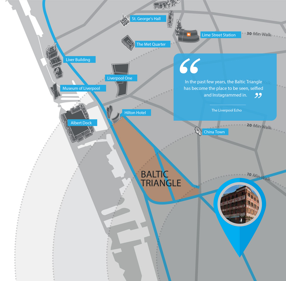 The Coleman's Building is ideally situated close to the Baltic Triangle, recently voted one of the top ten hippest areas in the UK, beating London's Shoreditch and Manchester's Northern Quarter. Independent clubs, cafes and restaurants line the streets and there is always something new and exciting to experience. Over the past decade, the influx of creative and digital firms moving into the Baltic has made it into Liverpool's creative hub, a creative, vibrant and bohemian space that encapsulates the diversity and energy this world-renowned city is famous for, and an ideal area for buy-to-let developments, promising outstanding returns on investment.